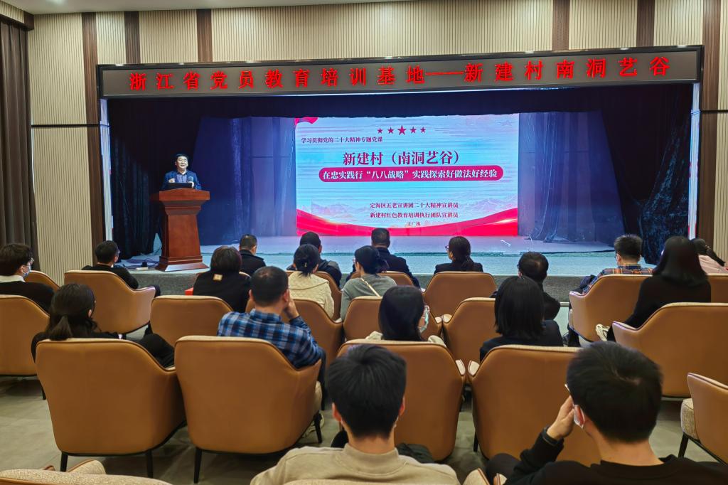 2015年5月25日,习近平总书记在定海新建社区考察调研期间,对新建社区美丽乡村建设给予充分肯定,并作出了“美丽中国要靠美丽乡村打基础”的重要论断。党员们沿着习近平总书记的足迹走进新建社区,在党建广场重温入党誓词与党旗合影,参观新建村乡村艺术馆,感受南洞美丽乡村的变化,到达共产党参观南洞“功勋号”、群创中心,追寻习近平总书记考察新建村足迹。新建村老党员为党员们讲授了《新建村在忠实践行“八八战略”实践探索好做法好经验》专题党课,海洋装备工程学院党总支中心组成员还进行了中心组学习,深刻感悟“八八战略”彰显的实践伟力。